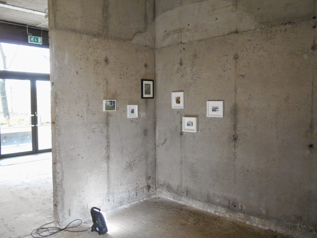 Long view of entrance space. The works that can be seen: 3 works on the left of the photo are by Mandy Payne, 1 work in the middle is by Sean Williams, and the rest of the works on the right are by Andy Cropper.